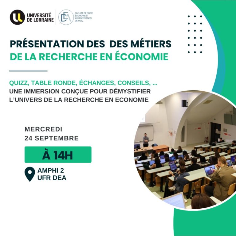 As part of Research Week at the University of Lorraine, the Faculty of Law, Economics, and Administration in Metz is organizing an exceptional immersion event for economics students in their second year of undergraduate studies, master’s first year, and master’s second year on Wednesday, September 24, 2025, from 2:00 p.m. to 4:00 p.m. in Amphi 2, to demystify the world of research and spark scientific vocations.